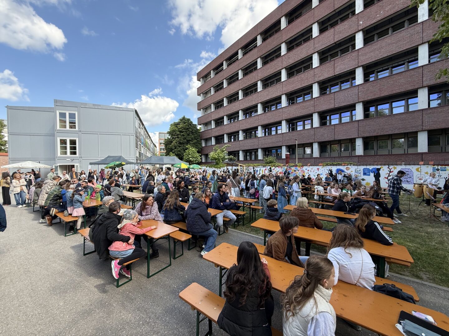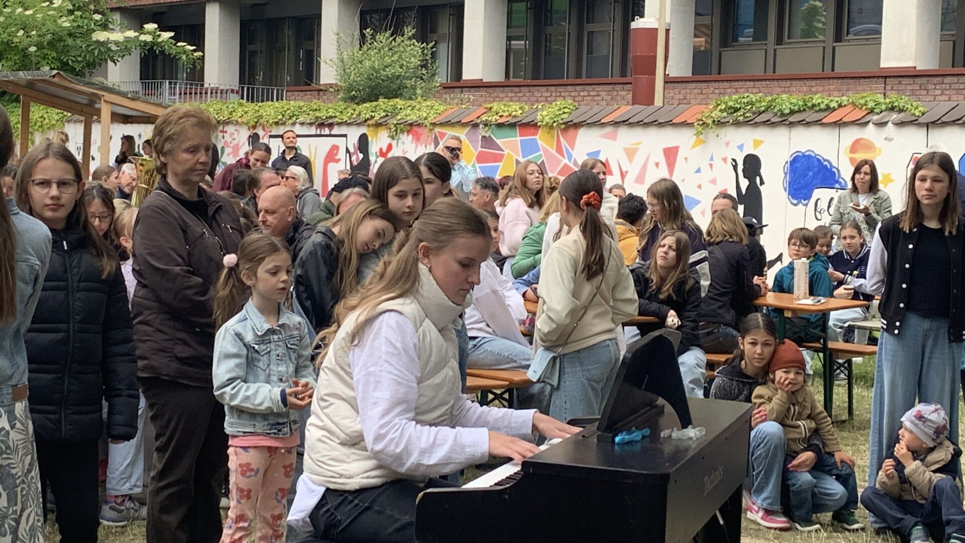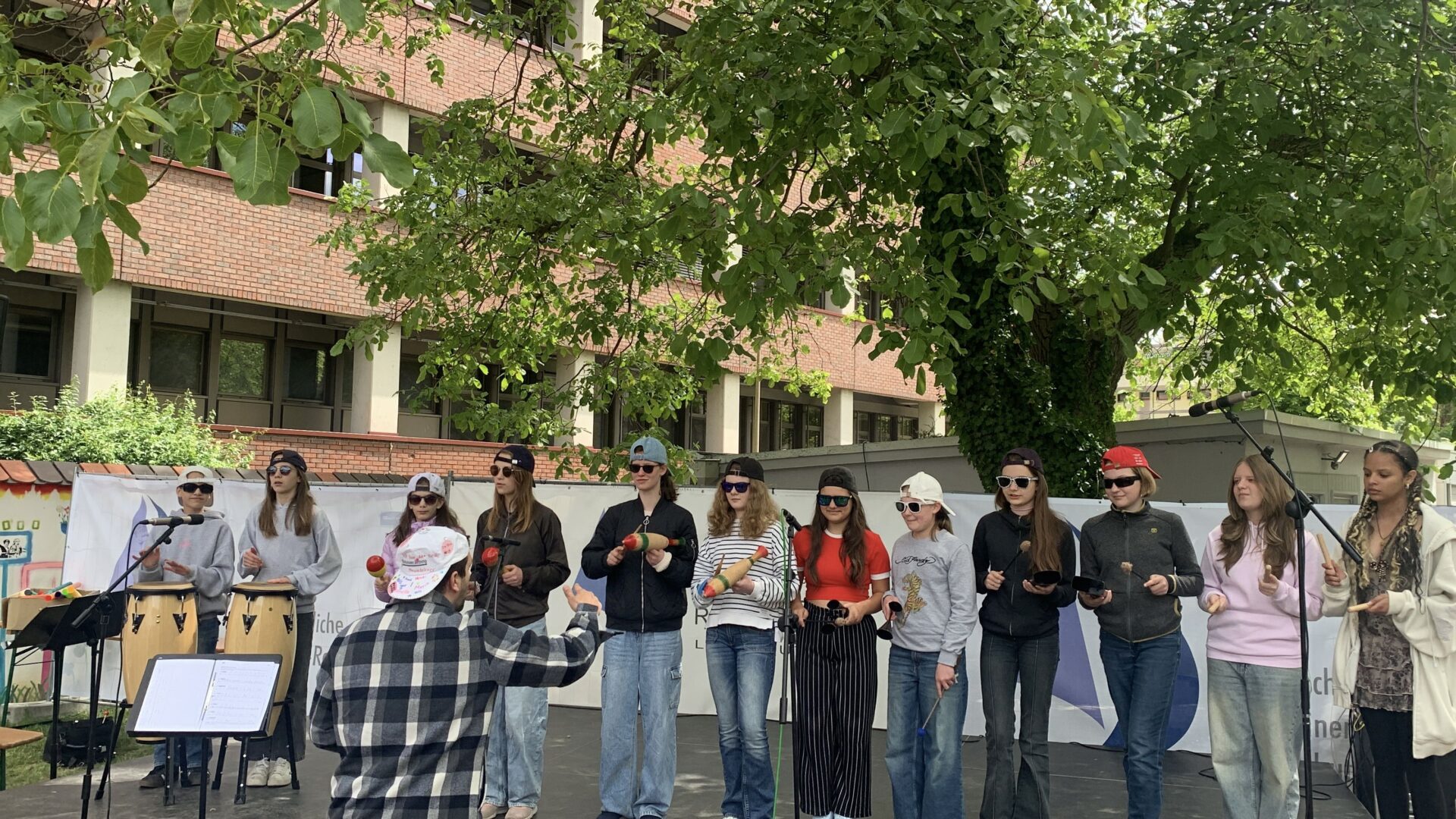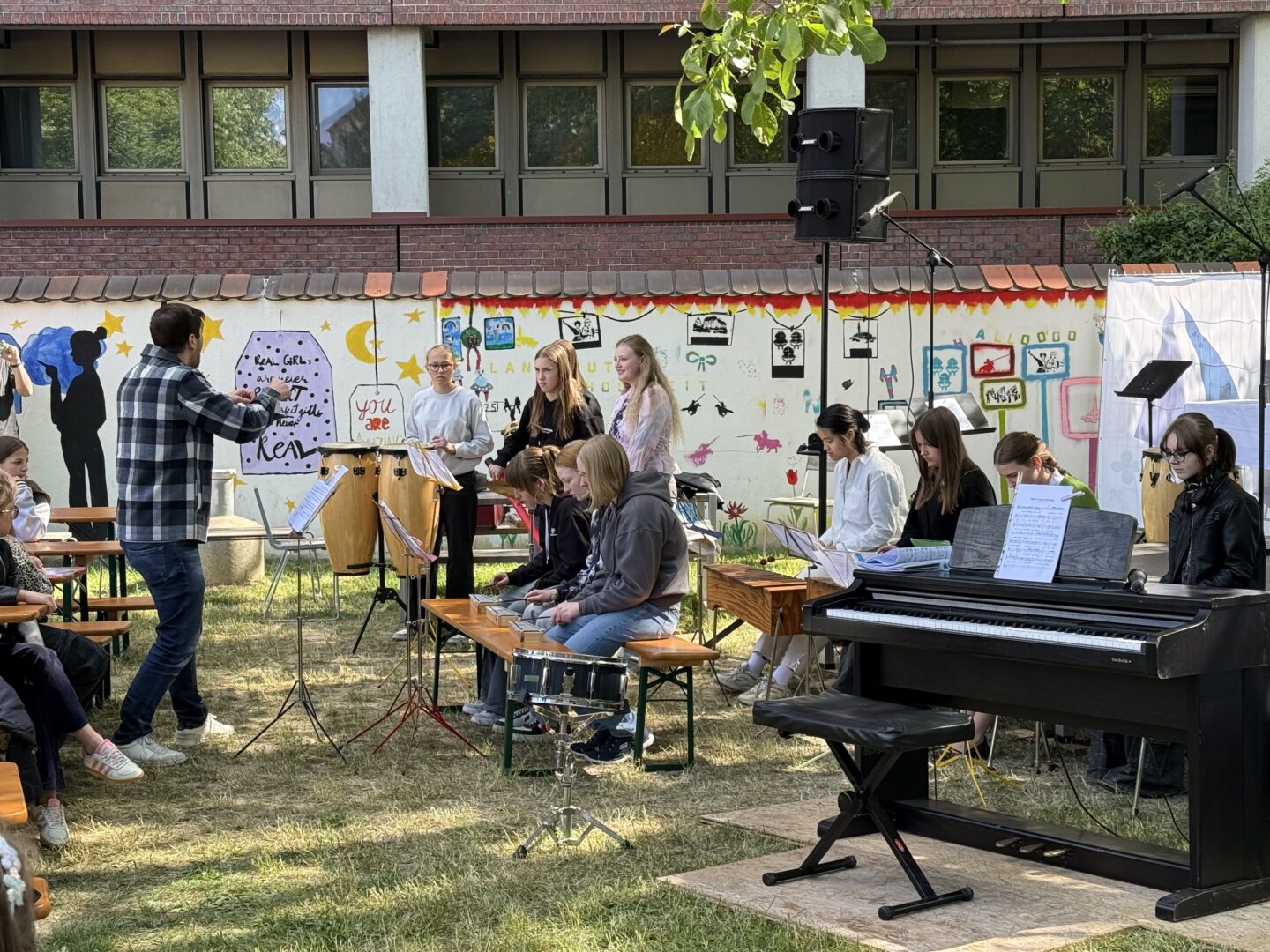 Solistische Glanzlichter setzten Franziska Duller aus der 5a, Tiziana Ganslmayer (10c) an der Klarinette mit „House of the rising sun“ und Ines Goldner (6a), die mit ihrem „Little Waltz“ zarte Harfenklänge in den Vormittag webte. Leonie Els (10e) zauberte am Klavier mit Ludovico Einaudis „Nuvole bianche“ eine fast meditative Stimmung – passend zu den weißen Wolken am blauen Himmel.
