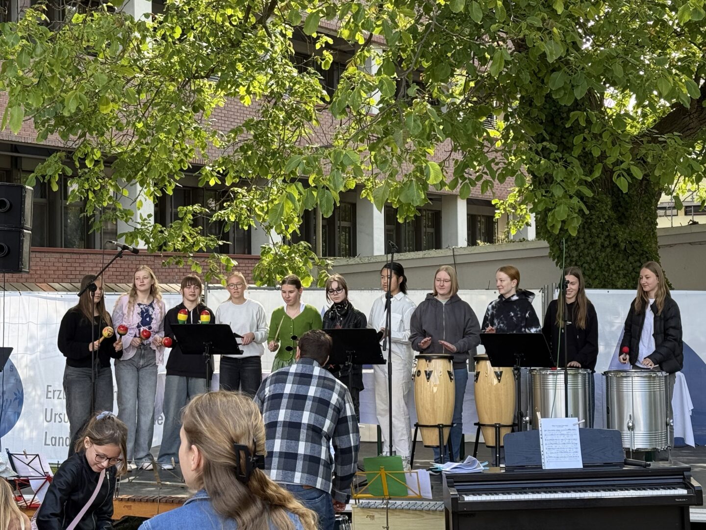 Bei strahlendem Sonnenschein und angenehm sommerlichen Temperaturen verwandelte sich das Freigelände der Ursulinen-Realschule am vergangenen Samstagvormittag in eine klingende Bühne. Der traditionellemusikalische Frühschoppenlockte zahlreiche Besucher an, darunter viele Familien, aber auch etliche ehemalige Schülerinnen und Lehrkräfte, die die Gelegenheit für ein Wiedersehen und ein Schwelgen in musikalischen Erinnerungen nutzten.
