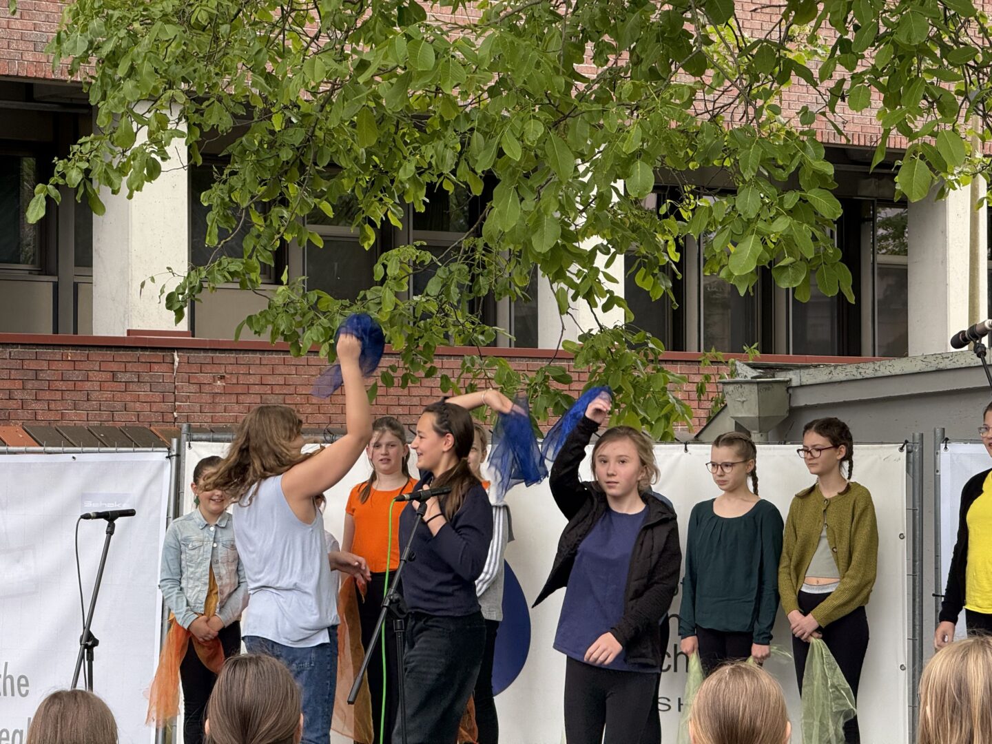 Das Querflöten-Ensemble unter Helga Hartl entführte das Publikum mit „Tiritomba“ in südliche Gefilde, während die Klasse 5a mit ihrem Tanz zu „Es tönen die Lieder“ den Frühling auch bewegt feierte. Passend zur Jahreszeit sang die Chor-Klasse 5b unter Matthias Scholz erwartungsvoll „Wenn der Sommer kommt“. Einen farbenfrohen und nachdenklichen Akzent setzte die Theater-Gruppe 5a (Leitung: Veronika Strejc) mit „Die Reise der Farben“. In einer fantasievollen Choreographie mit bunten Tüchern stritten die Farben, wer denn nun die schönste sei, um sich schließlich versöhnlich in den Armen zu liegen – getreu dem Motto „Es ist besser mit dir“. Anschaulich wurde es bei der Theatergruppe der 5b, die ihre Darbietung „Der magische Regenschirm“, untermalt von Musik und sanften Regengeräuschen, präsentierte.
