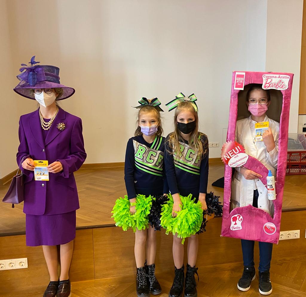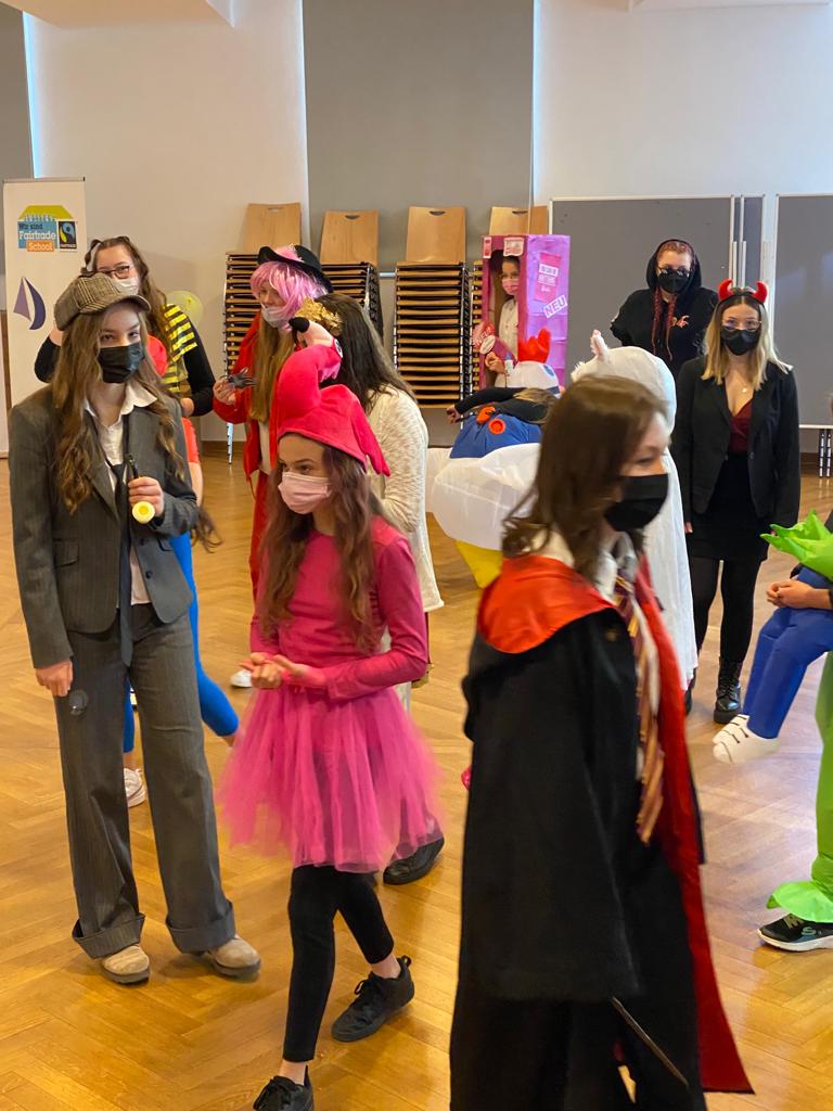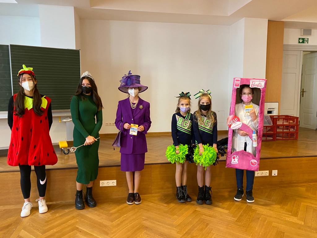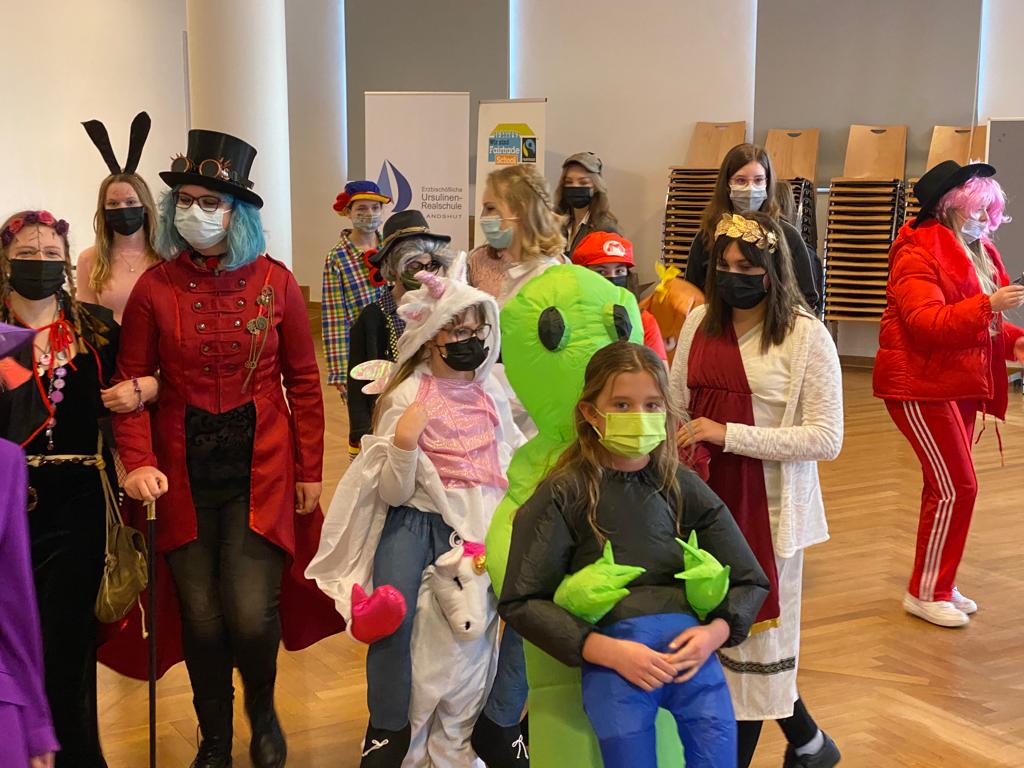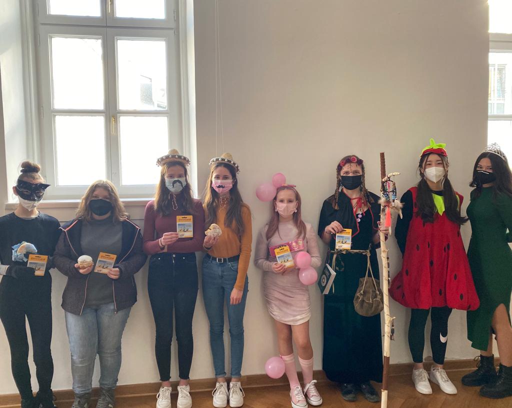 … und zum Dank dafür auch noch einen Kinogutschein erhalten, dann haben wir keinen royalen, sondern einen Narren-Besuch an der Schule: es ist Fasching. Diesen Anlass nutzten viele Schülerinnen und erfreuten durch eine bunte Maskerade verschiedenster Art – mit denen es sich auch hervorragend tanzen lässt. Freuen durften sie sich übrigens auch über leckere Krapfen. Zugegeben, bei manchen wurde die Freude vielleicht etwas gedämpft, als bemerkt wurde, dass man ein mit Senf gefülltes Exemplar erhalten hatte. Aber über Geschmack lässt sich ja bekanntlich streiten. Die kreativsten Kostüme wurden klassenintern ausgewählt, sodass die Schülersprecherinnen anschließend von dieser Karnevalstruppe die besten drei Verkleidungen prämieren konnten. Helau!