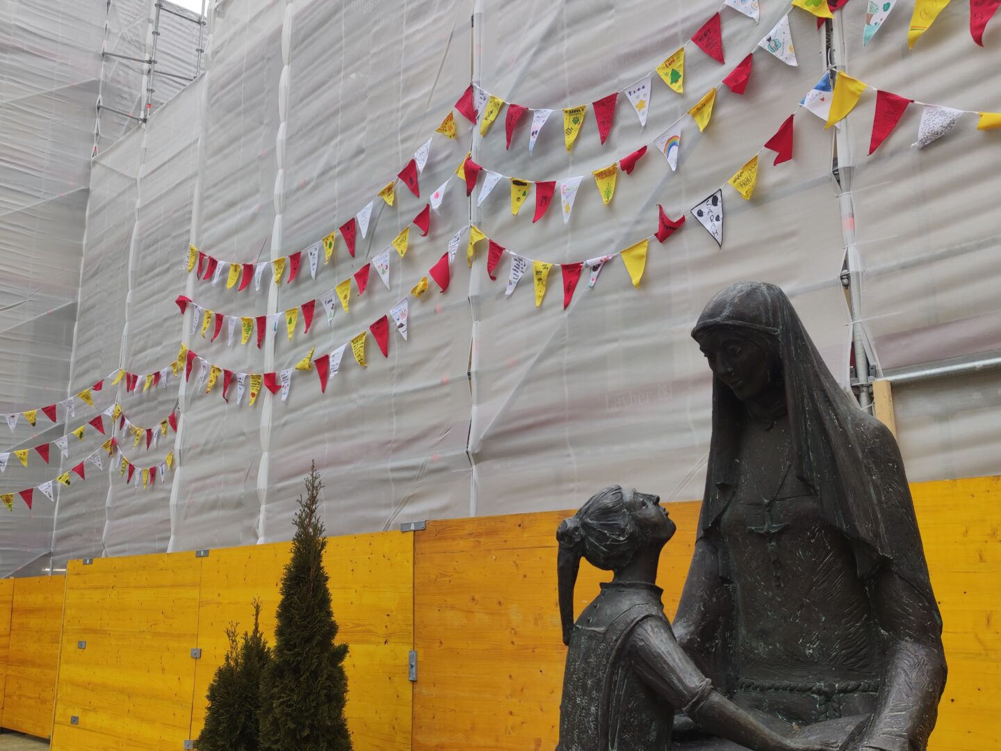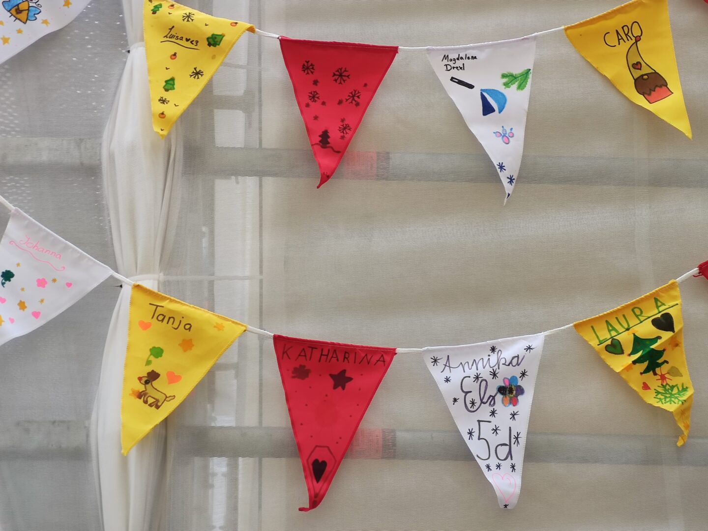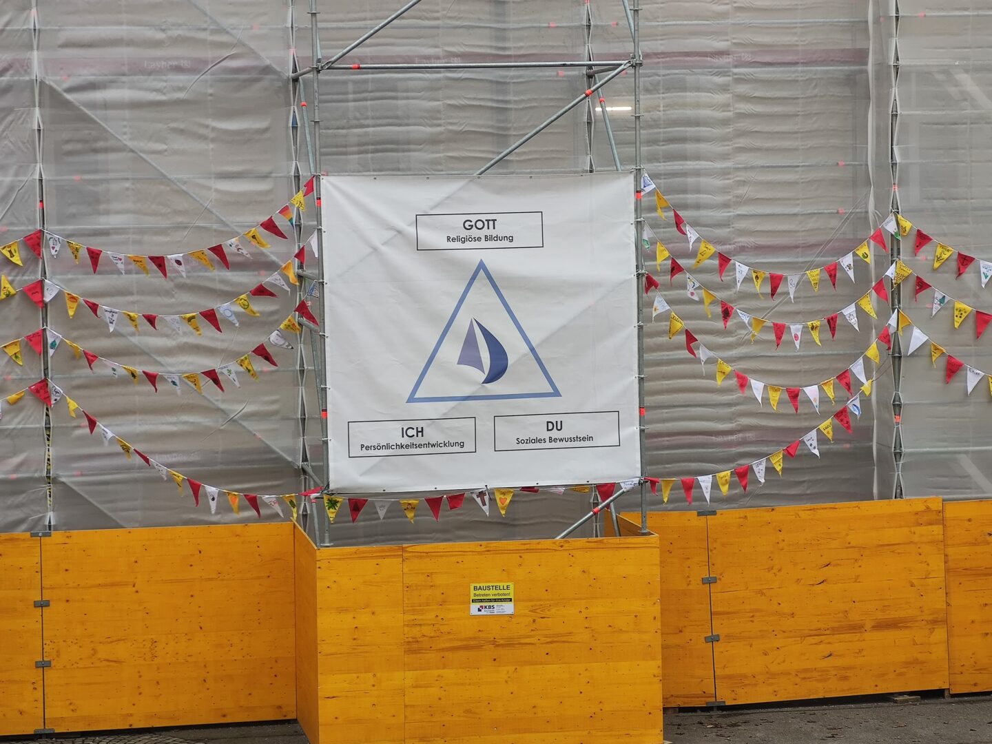 Wimpelketten sind beliebt. Man sieht sie als Dekorationselement z.B. auf Hochzeiten bedruckt mit „Just married“ oder bei Geburtstagsfeiern mit „Alles Gute“. In bunter Farbenpracht erstrahlen sie auch in deutlich höheren Gefilden wie dem Basis-Camp am Mount Everest – genügen hier jedoch als tibetische Gebetsfahnen einem kulturell-religiösen Anspruch. Auch als Zeichen der Freundschaft beim Wimpeltausch zu Beginn von Fußballspielen oder zur Erhöhung der Sicherheit beim Fahrradfahren finden sich diese meist dreieckigen kleinen Fahnen im Alltag wieder. Unsere Schülerinnen werden ebenfalls seit Kurzem davon begleitet. Denn aufgrund der Umbaumaßnahmen wird unser Pausenhof anstatt der vorher grünen Efeu-Wand jetzt von gelben Holzplatten und einem grauen Verkleidungsflies zum notwendigen Schutz umringt. Aus ästhetischer Sicht gewiss kein Highlight. Um dem entgegenzuwirken riefen Frau Schachtner und Herr Bauch in der Adventszeit zu Kreativität bei unseren Schülerinnen auf. Pro Klasse soll eine bunte Wimpelkette ausgeteilt werden, wobei jede Schülerin einen Wimpel nach eigenem Gusto gestalten darf. Nach einer ausgiebigen Testreihe zur Wetterbeständigkeit diverser Stift-Wimpelstoff-Kombinationen durch Frau Luginger konnte das passende Material letztendlich bestellt und die Idee in die Tat umgesetzt werden. Ergänzt durch ein Banner mit unserem pädagogischem Leitbild lassen nun 750 „Schülerwimpel“ die Baustelle nichtig erscheinen.