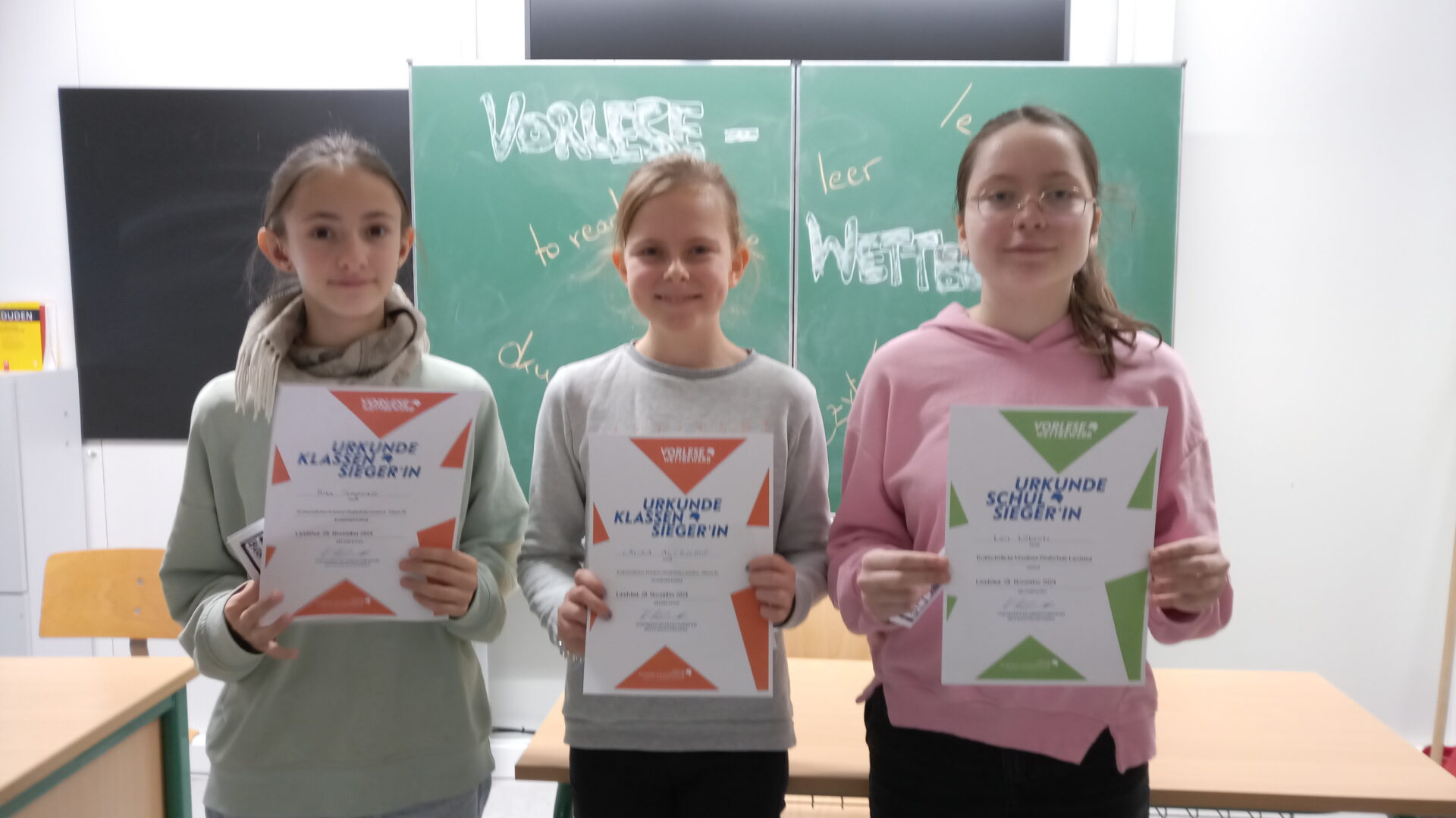 Heute fand dasSchulfinale desVorlesewettbewerbs2024an unserer Schule statt. Die vorher von den jeweiligen Klassen ermittleten Klassensiegerinnen traten zum Vorlesewettstreit an.Laura Altenhofaus der Klasse 6c las aus dem Buch "Hilfe, ich hab meiner superschlauen Schwester das Gehirn geklaut" von Jo Simmons.Pina Temporaleaus der 6b entschied sich für "Die Spiegelspringer" von Mona Herbst.Lea Löbnitzaus der 6a präsentierte Anja Janottas "Die Nacht in der Schule".Im zweiten Teil des Wettbewerbs lasen die Schülerinnen einen Fremdtext, und zwar den humorvollen Anfang von Saša Stanišić' preisgekrönten Jugendroman "Wolf".Alle Teilnehmerinnen stellten sich dieser Herausforderung mit großer Konzentration. Die Jury, bestehend ausJessica Bocker(Büchereimitarbeiterin),Marie Therese Fischer(Elternbeirat),Barbara Luginger(Schulleitung),Franz-Josef Scheidhammer(Fachleiter Deutsch),Kira Schön(Schülersprecherin) hatte die schwierige Aufgabe, die beste Vorleserin zu küren.Nach sorgfältiger Beratung verkündete die Jury die Siegerin des Schulfinales: Lea Löbnitz aus der Klasse 6a. Lea zeigte ingesamt einen guten Lesefluss und eine ausdrucksstarke Textgestaltung und wird unsere Schule in der nächsten Runde des Wettbewerbs vertreten. SchulleiterinAngela Schleibingergratulierte der Siegerin herzlich und der Fachleiter überreichte den Mädchen die Urkunden. Alle Klassensiegerinnen erhielten zudem einen Buchgutschein vom Elternbeirat - auch als Anreiz, die Welt der Bücher weiter zu erkunden.