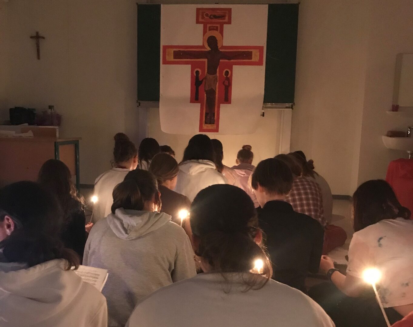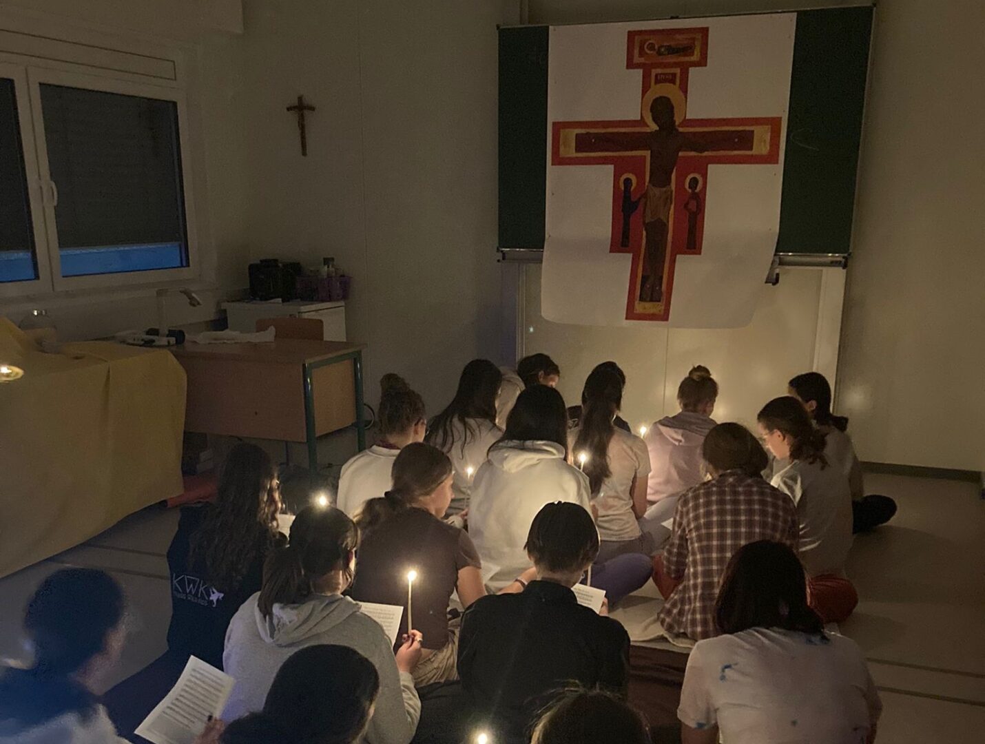 Ein besonderes Highlight des Abends stellte das gemeinsame Taizé-Gebet dar, welches Heimerl passend auf die Gruppe abgestimmt hatte. Die Religionslehrerin berichtete über ihre eigenen Erfahrungen inTaizéund schilderte den Tagesablauf der Menschen, die dort aus aller Welt zusammenkommen, um gemeinsam zu essen, zu singen, zu entspannen und in Stille bzw. Meditation zu Gott zu finden. Vor der halbstündigen Andacht mussten allerdings noch einige Vorbereitungen getroffen werden wie das Proben der Lieder und die Zuweisung der Sprechertexte für die Fürbitten und Lesungen. Alle Anwesenden erhielten noch die für Taizé typischen Gebetskerzen.