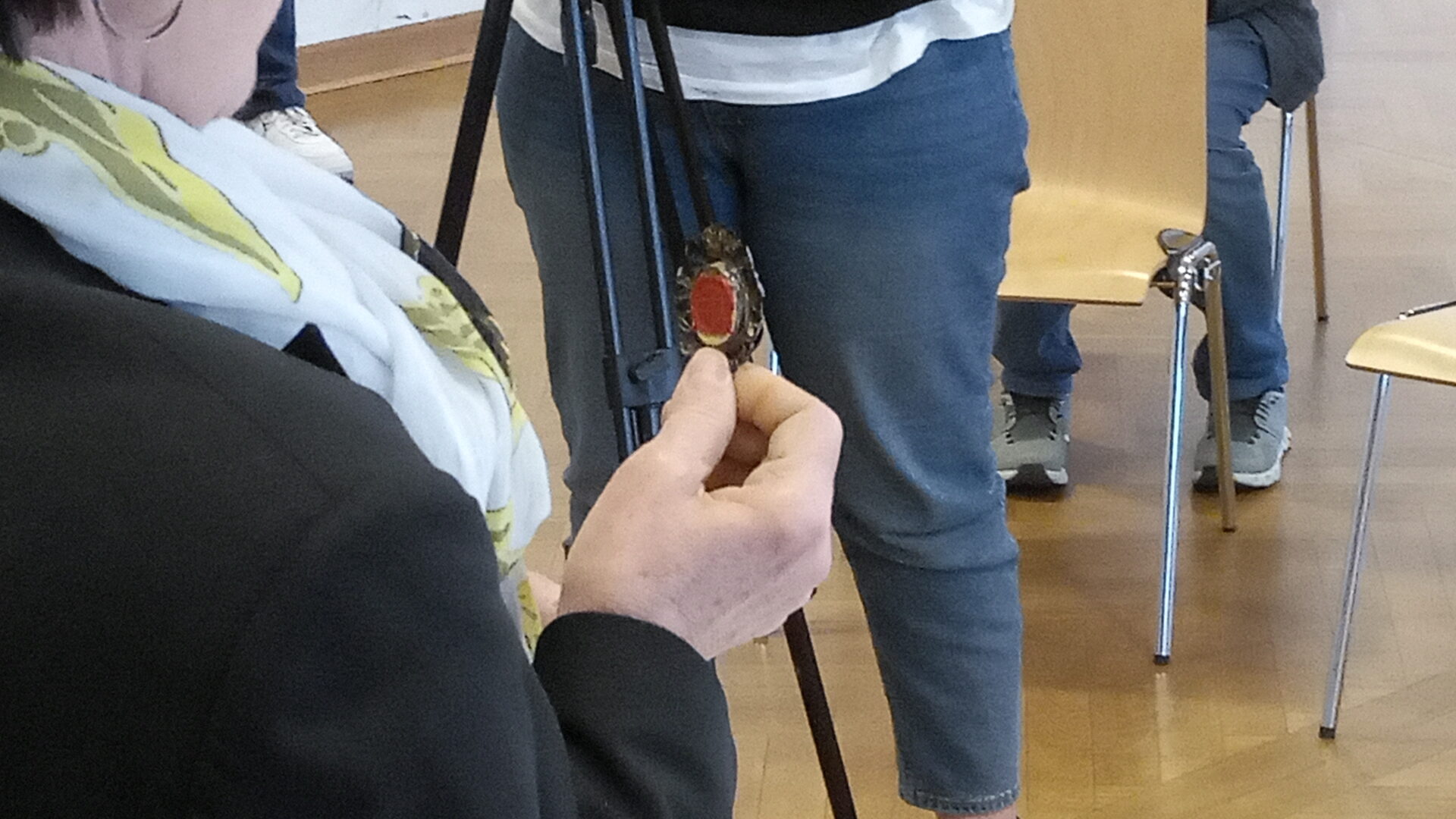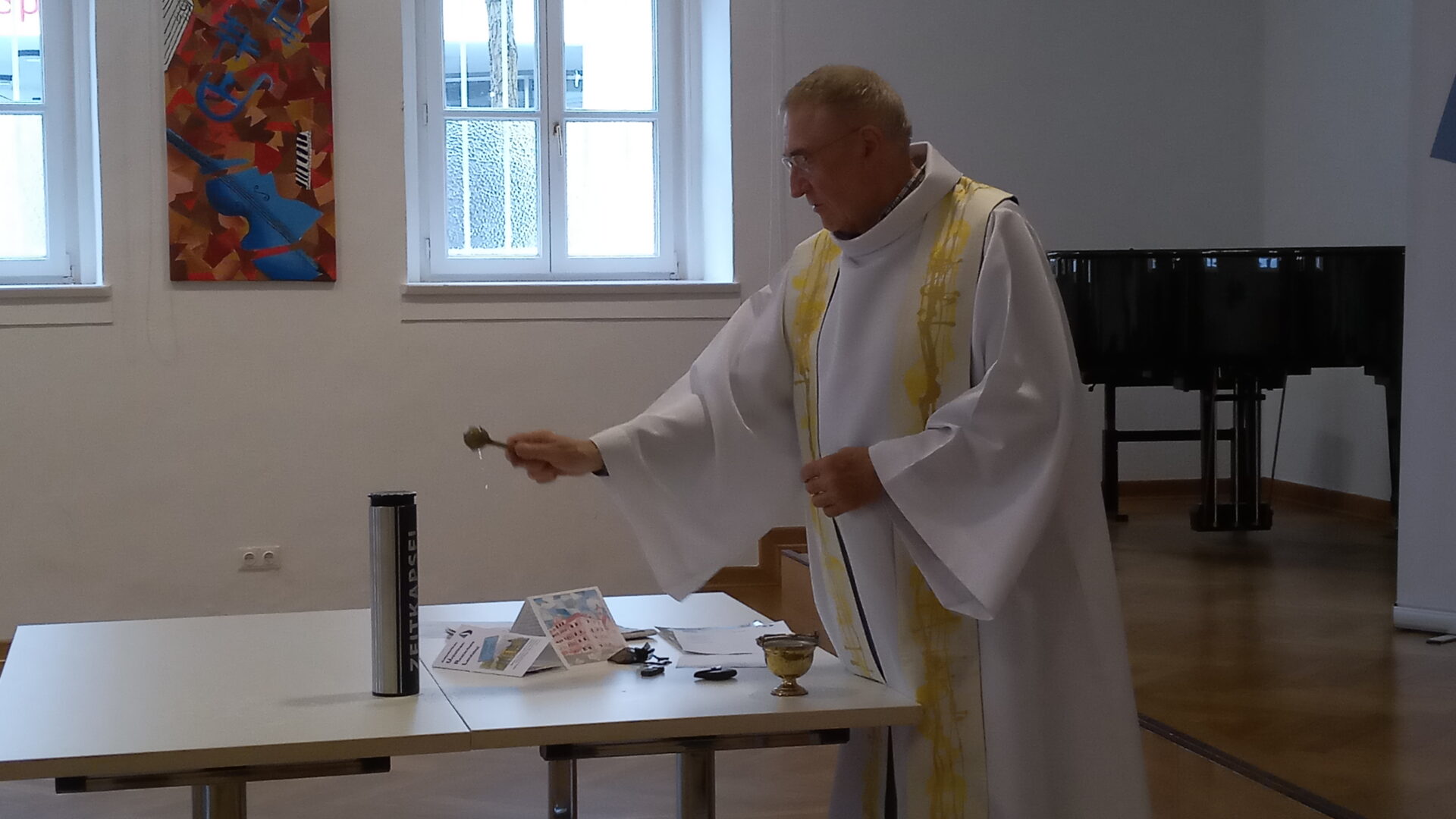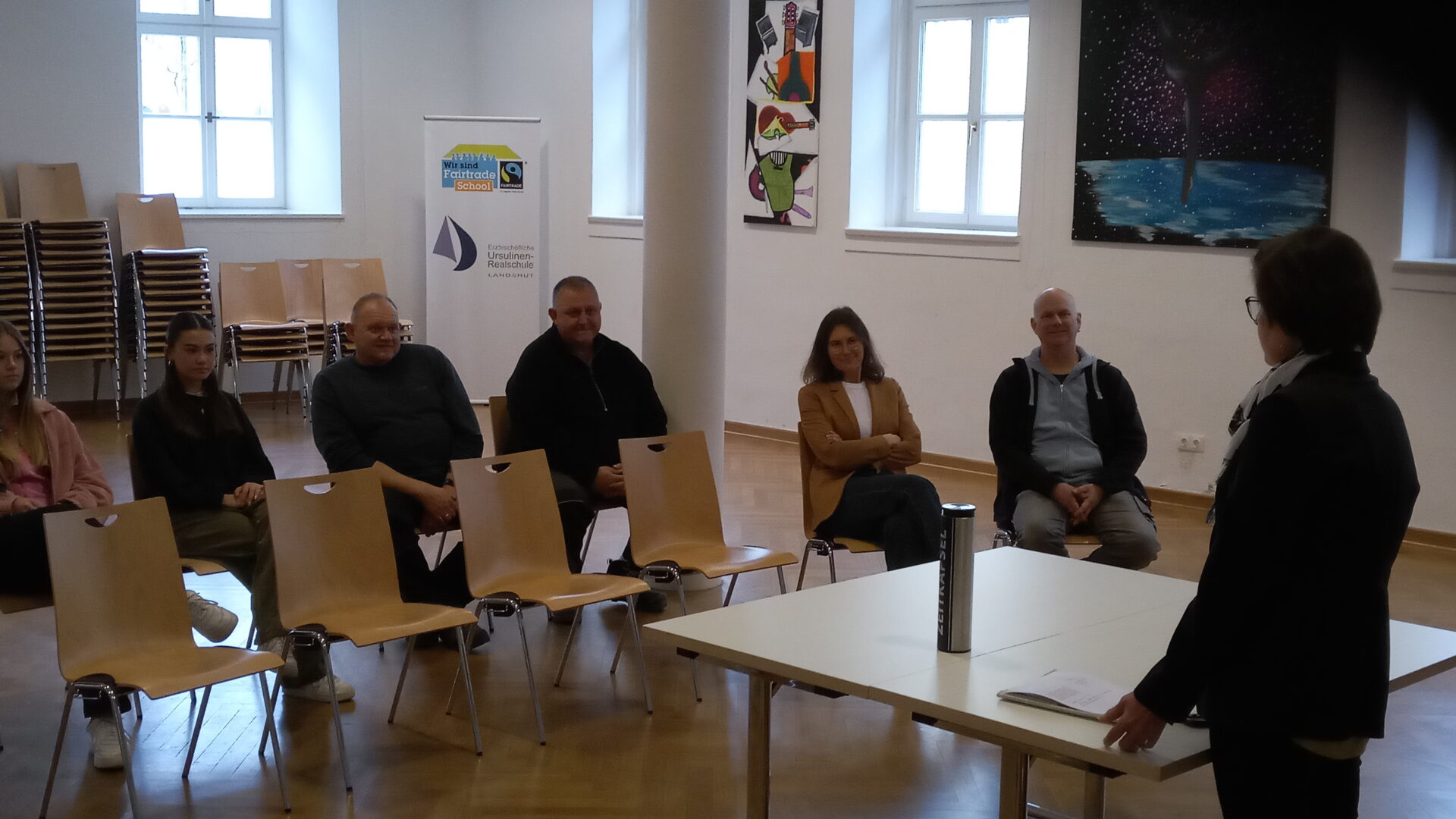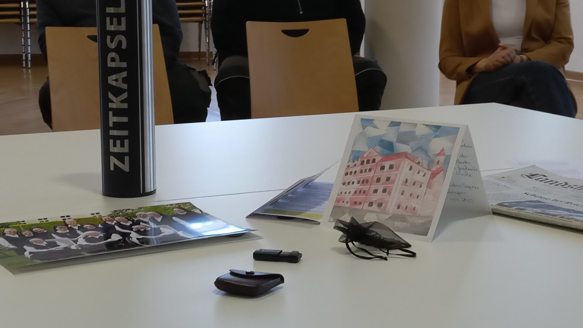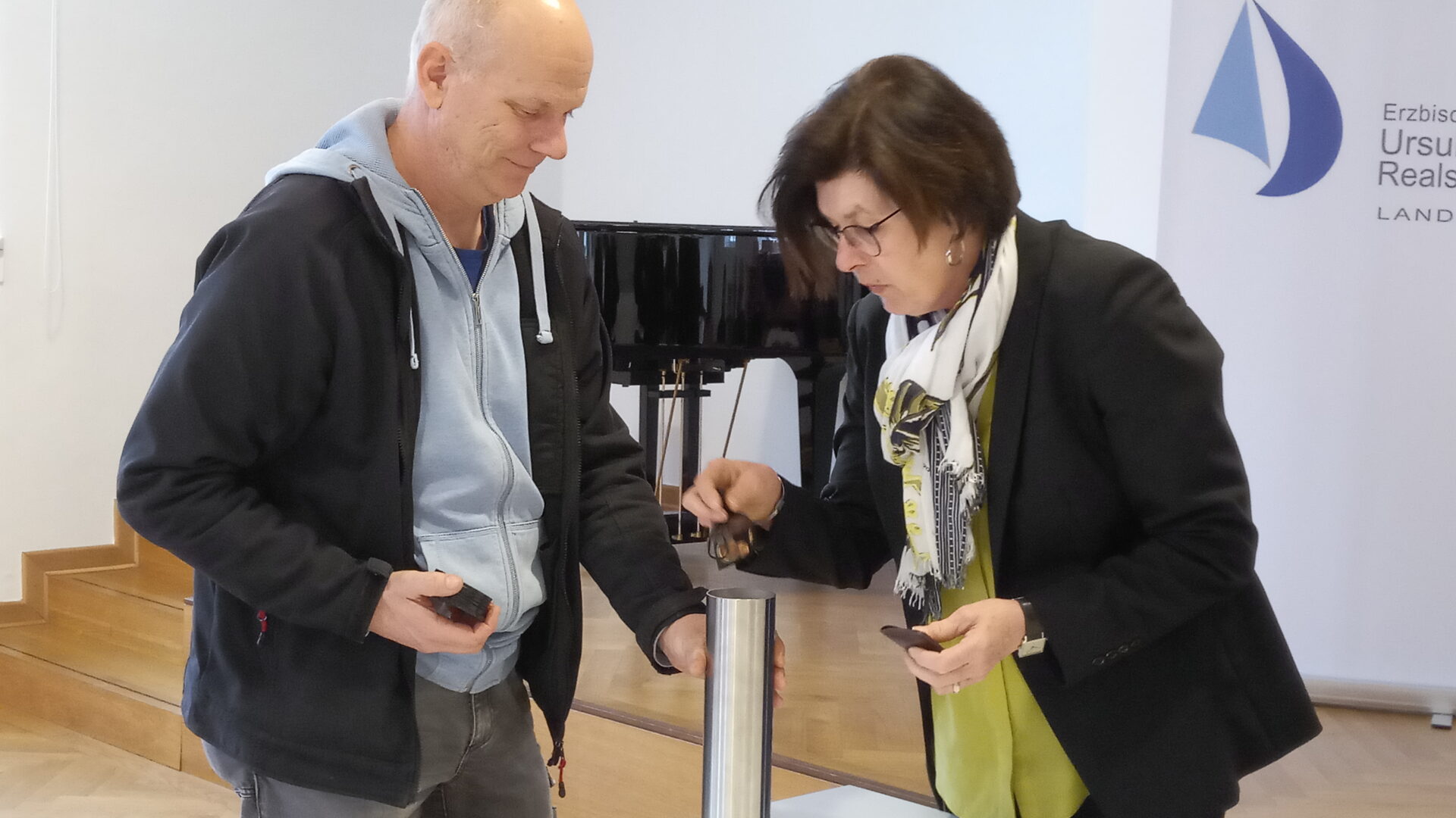 Heute, knapp vier Monate später, wurde eine neue Zeitkapsel gefüllt. Diese soll nun wieder für viele Jahrzehnte verschlossen bleiben und erst zu einem späteren Zeitpunkt geöffnet werden.Die neue Kapsel enthält unter anderem Münzen, einen Schulflyer und die heutige Ausgabe der Landshuter Zeitung. Auch ein USB-Stick mit einem Film von Isar-TV über die Öffnung der alten Zeitkapsel wurde darin platziert. Eine Reliquie, die im Zusammenhang mit Angela Merici steht, sowie ein Bild der Ursulinen-Schwestern, zum Zeitpunkt als sie das Kloster verließen, wurden ebenfalls beigefügt.Pfarrer Armin Weyers sprach den aronitischen Segen und betonte die Hoffnung, dass die Kapsel dereinst in friedlichen Zeiten geöffnet werde. Hausmeister Alexander Lang verschloss die Kapsel fachmännisch, damit die Inhalte über eine lange Zeit hin gut konserviert sind.Schulleiterin Angela Schleibinger rief die Schulsprecherinnen auf, das Ereignis im Tagebuch zu vermerken. Wenn die Enkelinnen der Schüler eines Tages von der Öffnung der Zeitkapsel erfahren, erinnern sie sich vielleicht daran, dass ihre Oma dies ins Tagebuch eingetragen habe.Die neu gefüllte Zeitkapsel wurde schließlich an den Zimmerer übergeben, der sie wieder in der Turmkugel verankern wird. Dort wird sie nun darauf warten, dass sie in einer unbekannten Zukunft wieder entdeckt wird.