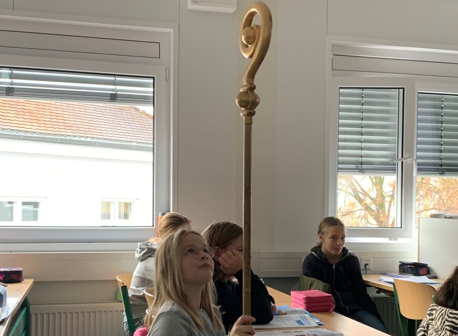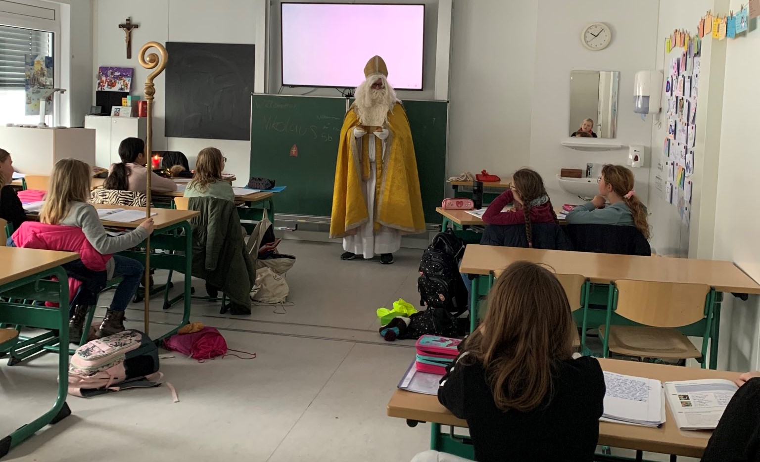 Drei goldene Äpfel soll er ihnen geschenkt haben, um sie vor dem drohenden sozialen Abstieg zu bewahren. Nikolaus, der große Heilige aus dem kleinasiatischen Myra, war auch gestern an unserer Schule zu Gast. Anders als in der Legende musste er sich an unserer Schule wenig Sorgen um die Mädchen der fünften Klasse machen. Eine gute Bildung an unserer Schule wird ihnen einen guten Platz in der Gesellschaft sichern. Keine goldenen Äpfel, aber ein paar süße Gaben hat er natürlich trotzdem gebracht: Schokoladennikoläuse, und zwar für alle Schülerinnen und Lehrkräfte der Schule.