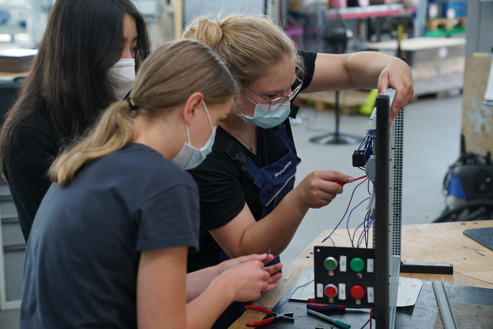 Landshut.Kein alltäglicher Start in den Nachmittag fürzwölf Schülerinnen der Ursulinen- Realschulein Landshut: Sie werden von Auszubildenden des BMW Group Werks Landshut persönlich mit ihren Fahrzeugen an der Schule abgeholt und ins Ausbildungszentrum des BMW Group Werks chauffiert. Dort erwartet sie im Rahmen ihres Wahlfachs ein spannender Nachmittag im Zeichen der Technik.Jeden Mittwoch steht bei den Schülerinnen der achten und neunten Klassen ein technisches Wahlfach auf dem Stundenplan. Die Schülerinnen haben die Möglichkeit im Rahmen der Girls‘ Day Akademie hinter die Kulissen der Berufsausbildung im BMW Group Werk Landshut zu blicken. Nach Corona-bedingten Online-Kursen fand der erste Termin vor Ort statt. Unter der Anleitung von Auszubildenden bauten die Mädchen eine Elektroinstallation auf. „Wir wollen junge, technikinteressierte Mädchen an unsere Ausbildungsberufe heranführen und sie von der Attraktivität einer Ausbildung im BMW Group Werk Landshut überzeugen“, so Ausbildungsleiter Ralf Franke.Die Girls‘ Day Akademien in Bayern werden unter dem Dach des Bildungswerks der Bayerischen Wirtschaft e. V. in Kooperation zwischen Schulen und Unternehmen durchgeführt. Die Akademien finden als Wahlfach zusätzlich zum regulären Unterricht statt und richten sich an Gruppen von zwölf bis fünzehn Schülerinnen. Die Teilnehmerinnen lernen naturwissenschaftliche und technische Inhalte anhand praktischer Arbeiten in Ausbildungsbetrieben kennen.Das BMW Group Werk Landshut ist in diesem Schuljahr erstmalig Kooperationspartner der Girls‘ Day Akademie und vom Projekt überzeugt. „Schülerinnen, die sich vorstellen können, einen technischen Beruf zu ergreifen, möchten wir gerne die Berührungsängste nehmen. Das Projekt gibt uns die Chance, eine erste Bindung zu den jungen Mädchen aufzubauen“, so Ralf Franke.